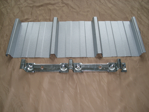YX41-250-750屋面系統(tǒng)專用固定件可以讓熱脹冷縮時讓屋面板沿著屋面斜度方向緩慢滑動,具有補償功能,在緩慢的滑動過程中與固定支座緊密相扣,不會影響屋面與結(jié)構(gòu)的結(jié)合問題。